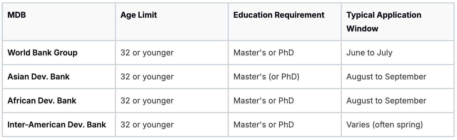 This table gives you a snapshot of the key requirements for the major MDB Young Professional Programs. Application windows can shift slightly each year, so always double-check the official MDB careers site.