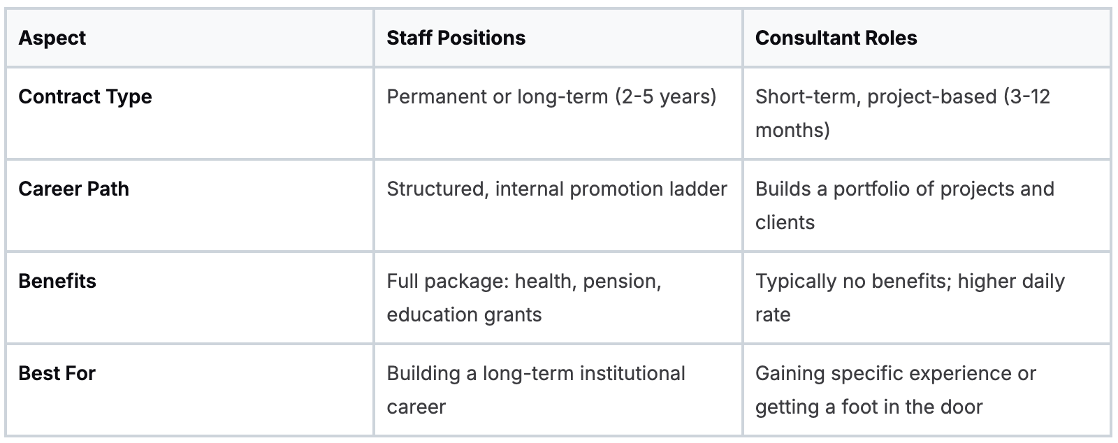 Stopping there is a huge mistake. You also need to track consultant opportunities. These are project-based contracts, ranging from a few weeks to a year or more. A consultancy is one of the best ways to get your foot in the door, build a track record, and prove your value on a real project. These roles are often posted on separate portals or through aggregators like the UN Global Marketplace.