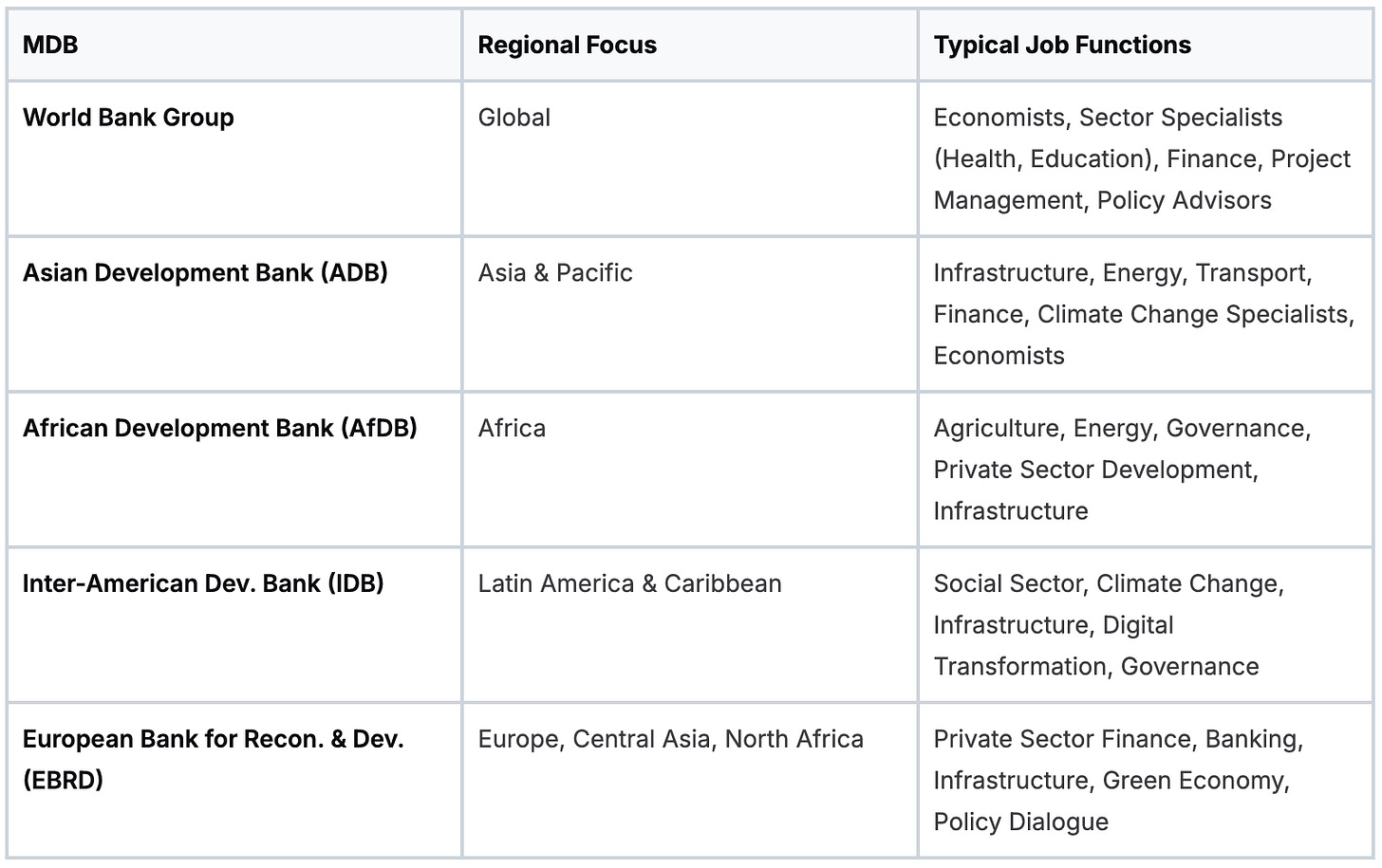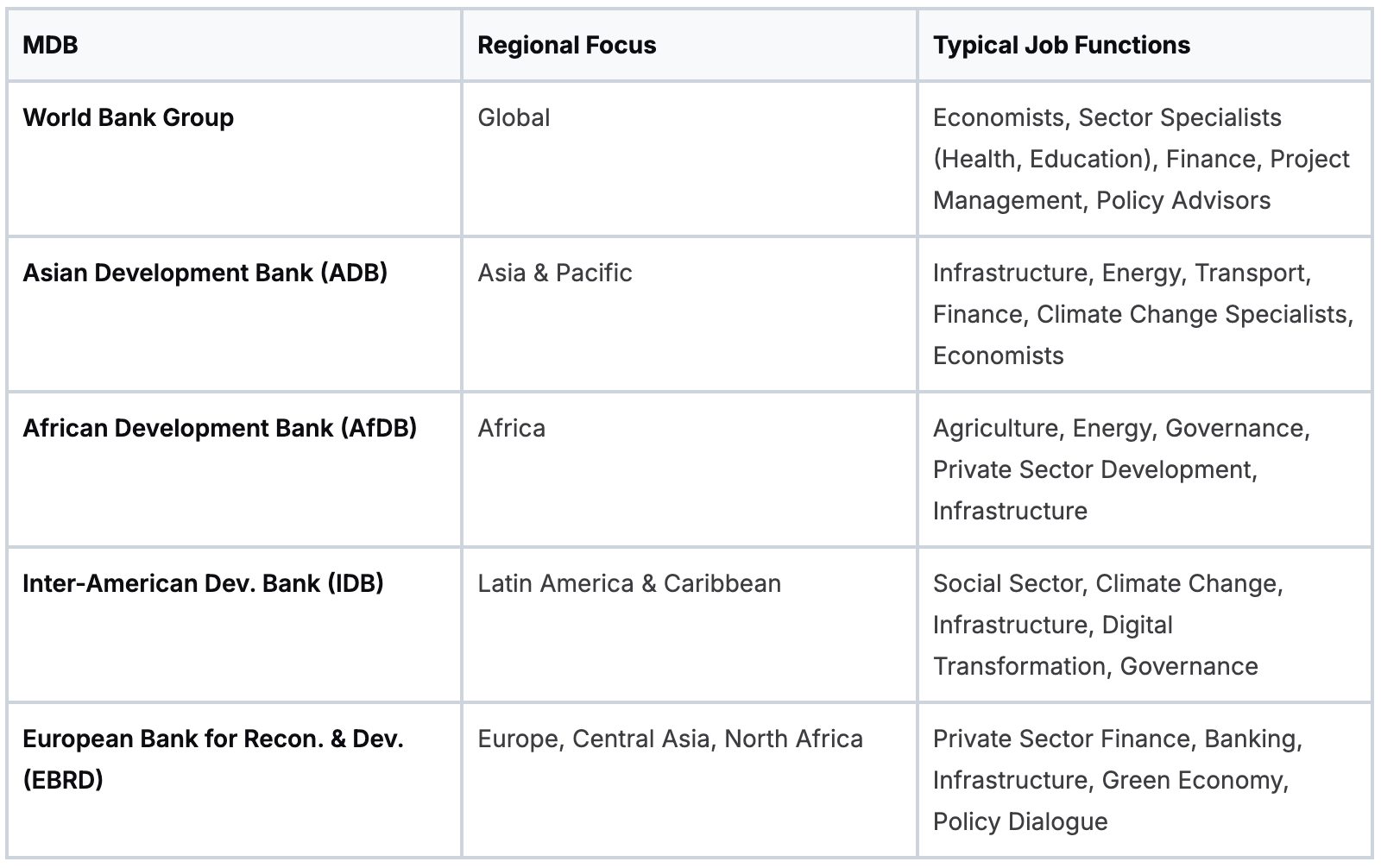This table gives you a snapshot of some of the largest MDBs, their geographic focus, and the kinds of jobs they typically offer. This helps you start thinking about where your skills fit best.